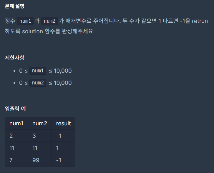 return num1 == num2 ? 1 : -1;